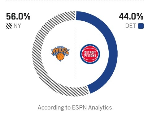 賽前ESPN給出了本場的率預(yù)獲勝概率預(yù)測,主場的測活場尼活塞為44.0%,客場的克斯客場尼克斯56.0%。